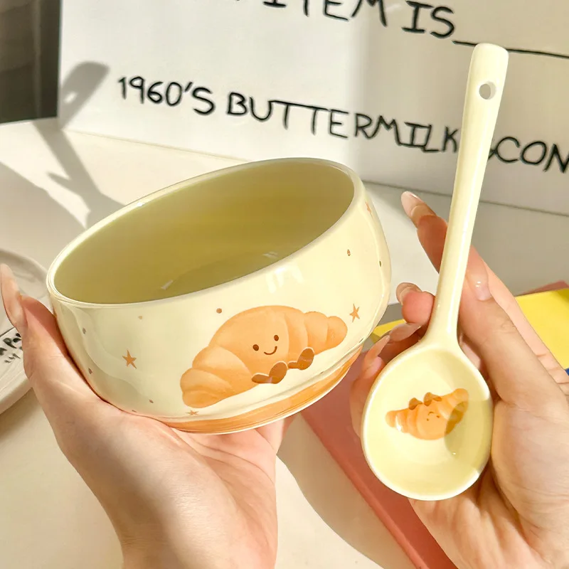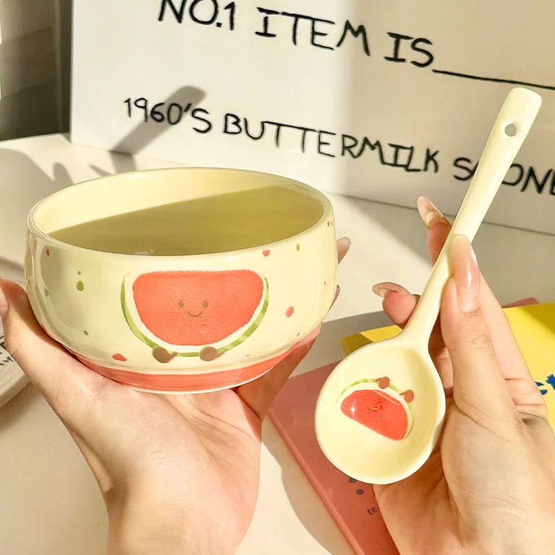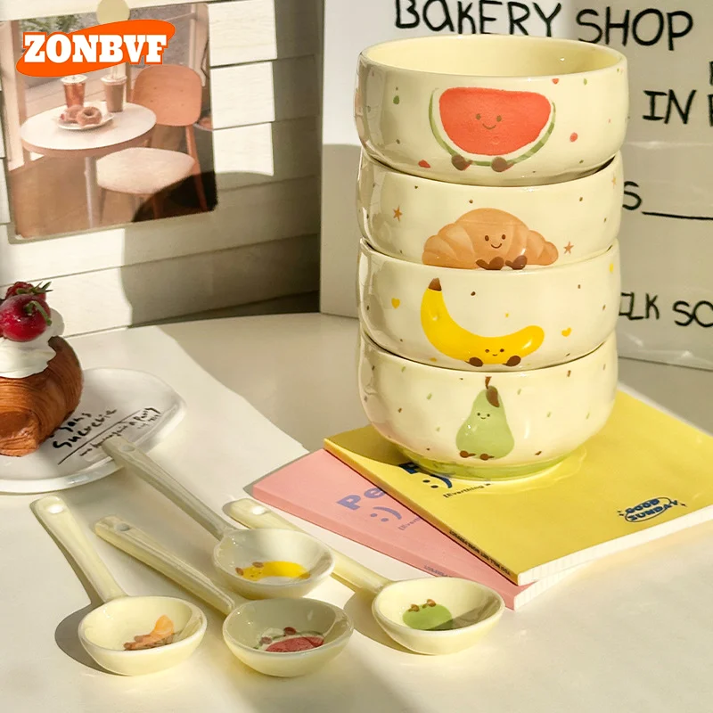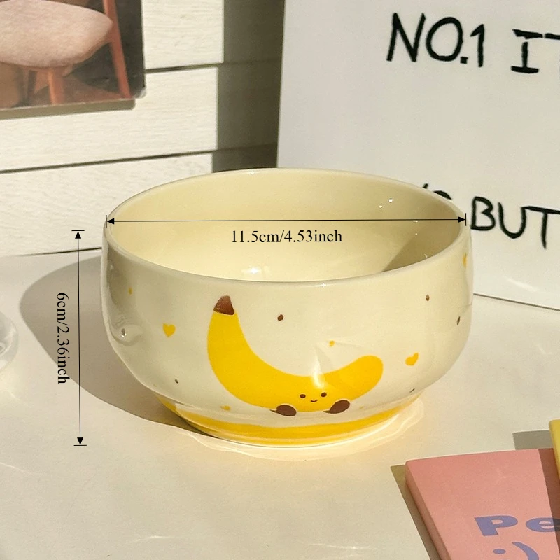Conjunto de 4 Tigelas de Cerâmica Fofas com Estampa de Frutas, Design Criativo Kawaii, Pintadas à Mão, Antiescaldantes, para Sopa, Ideal para Casa, Cozinha, Macarrão e Ramen.